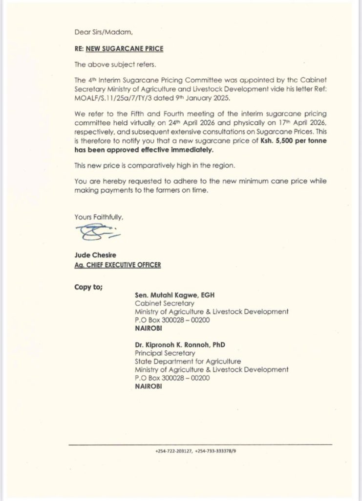 In a directive issued by the Kenya Sugar Board on April 24, 2026, all millers were instructed to immediately implement the new price and ensure prompt payments to farmers.